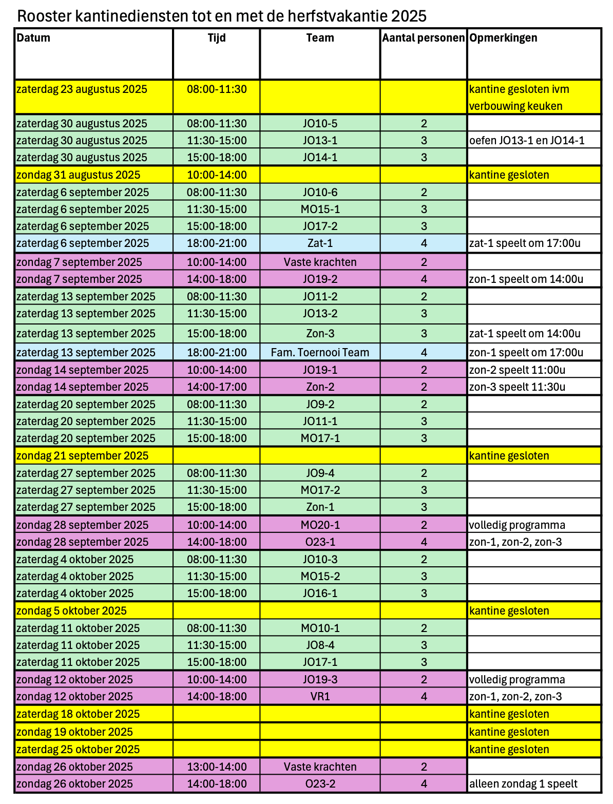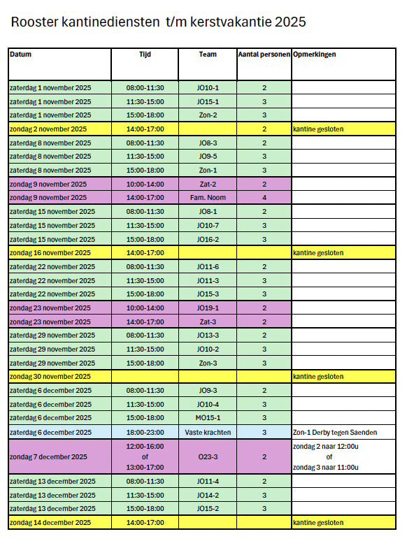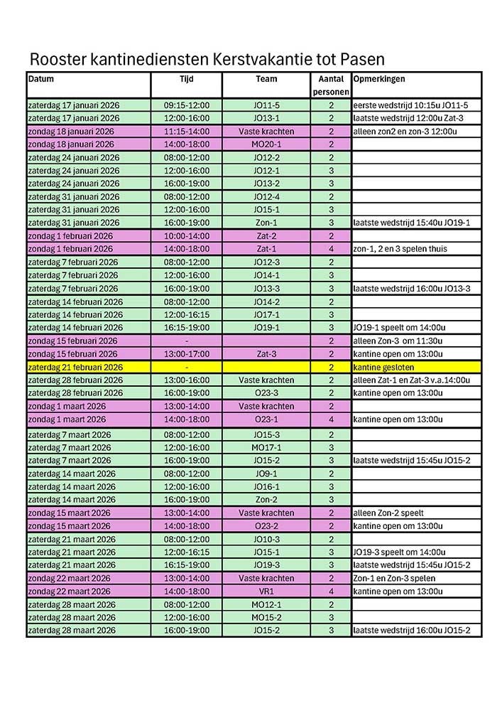 Het kantinerooster wordt per team ingedeeld. Het team mag dan zelf onderling bepalen wie van het team de dienst op dat tijdstip invult. De vasteleider, trainer en/of aanvoerder van het team bevestigt zo snel als mogelijk via de mail de personen voor de betreffende dienst.