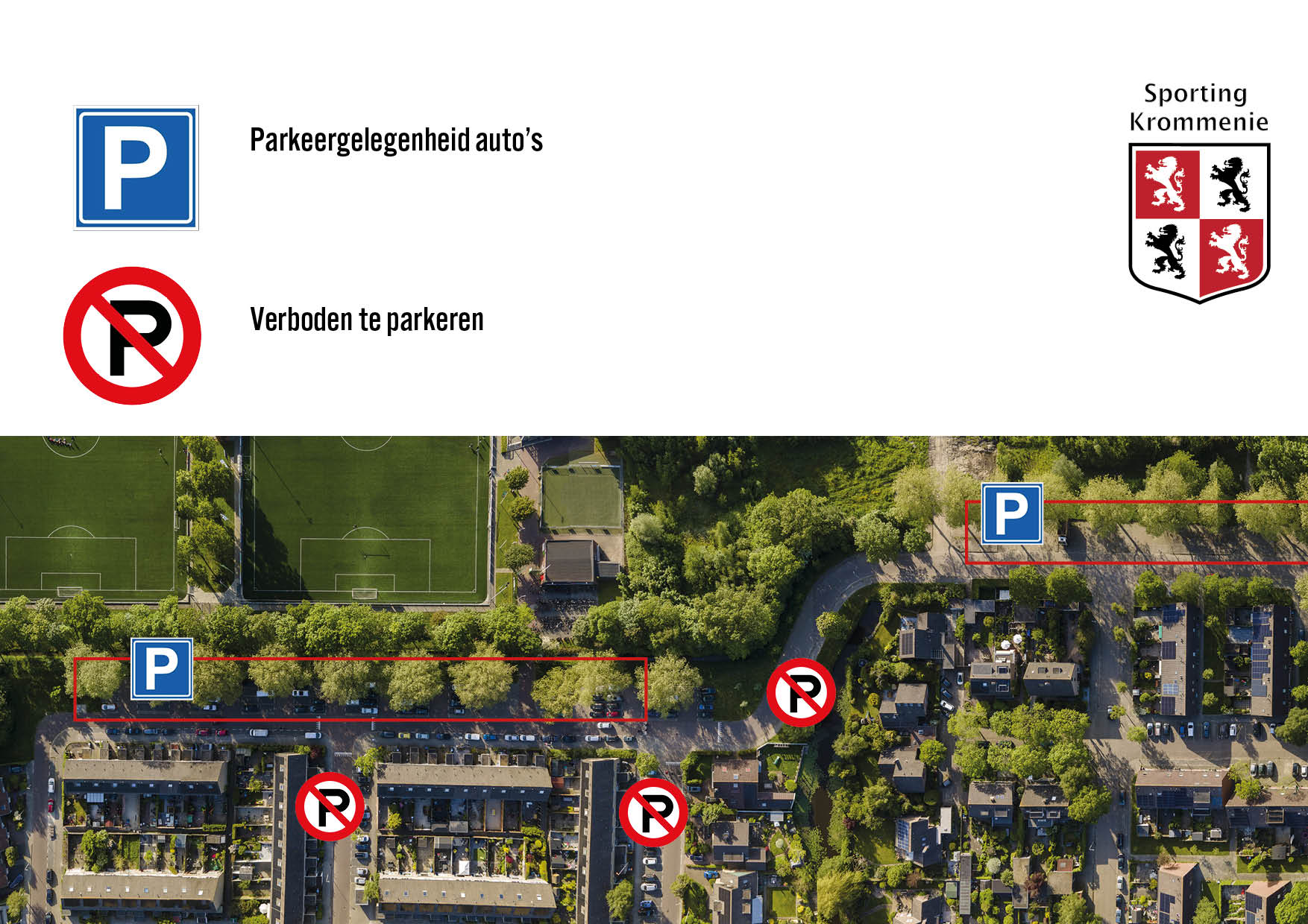 Om de buurt zo min mogelijk te belasten vragen wij om vooral op de fiets te komen. Mocht je wel met de auto komen dan zijn er twee parkeermogelijkheden: De parkeerplaatsen die aan Sporting grenzen en de parkeerplaatsen die verderop op de maarslaan aan het braakliggende terrein grenzen. Het is verboden om op de stoep in de bocht of in de wijk te parkeren. Zie afbeelding.